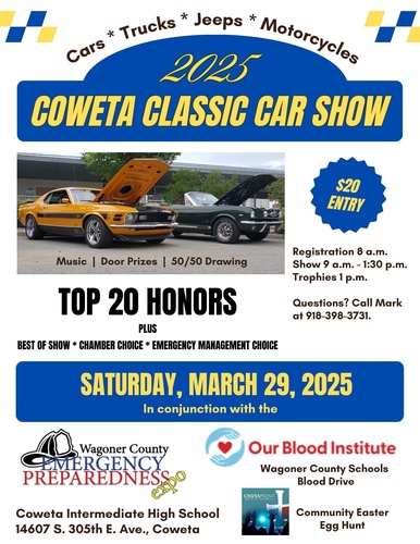 The Coweta Classic Car Show is coming to Coweta this spring in conjunction with the Wagoner County Emergency Preparedness Expo! This event will showcase cars, trucks, jeeps and motorcycles.